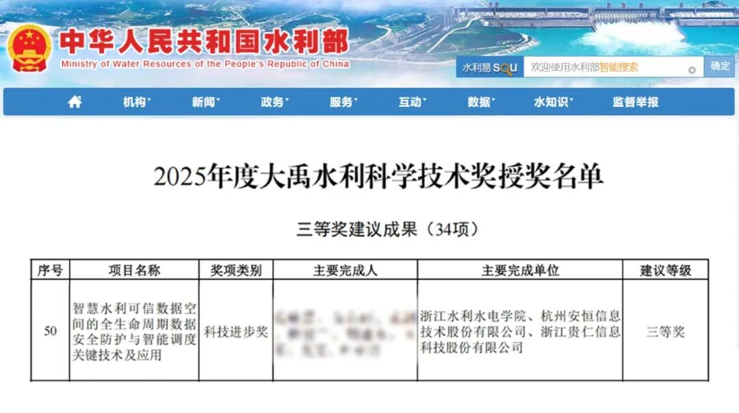 近日,2025年度大禹水利科学技术奖(以下简称 “大禹奖”)授奖名单公示,行业目光再度聚焦一批深耕水利科技、赋能水利高质量发展的创新成果与先锋力量。在本次公示的80个奖项中,由浙江水利水电学院、杭州安恒信息技术股份有限公司、浙江贵仁信息科技股份有限公司(以下简称“贵仁科技”)联合创新的《智慧水利可信数据空间的全生命周期数据安全防护与智能调度关键技术及应用》项目,历经专家层层严苛遴选、多轮专业评审,成功斩获大禹水利科学技术奖三等奖。
